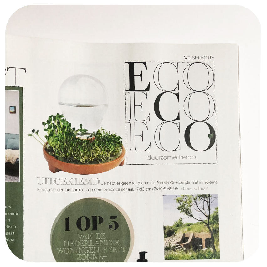 'Uitgekiemd'Je hebt er geen kind aan: de Patella Crescenda laat in no-time kiemgroenten ontspruiten op een terracotta schaal.