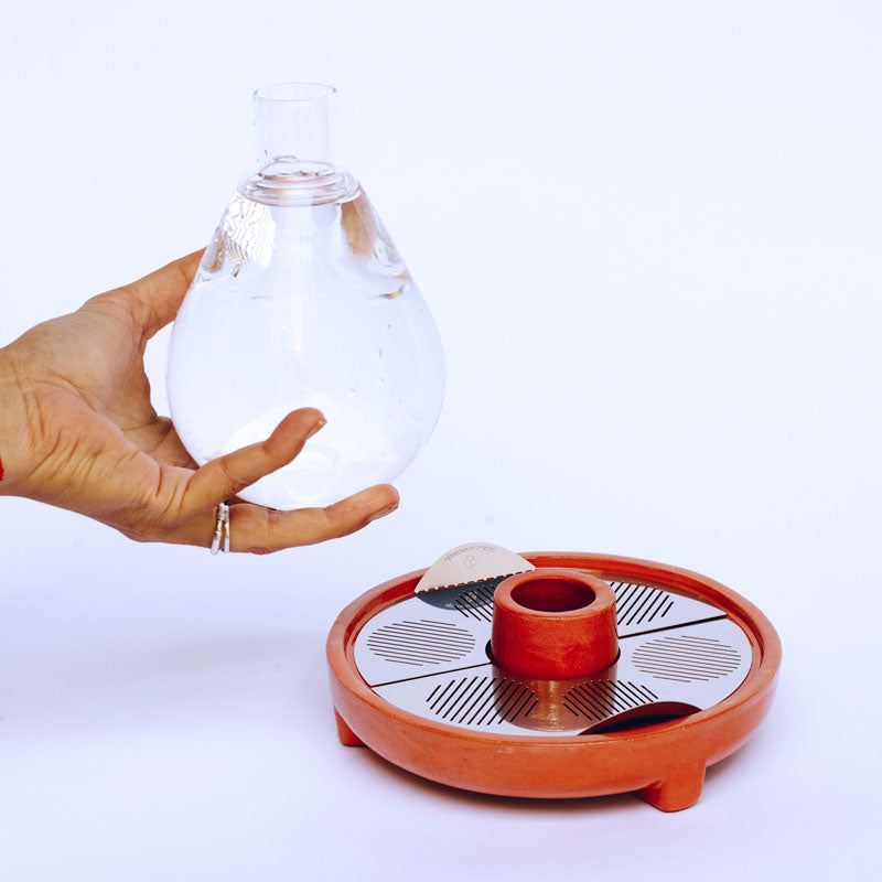 Het glazen reservoir van de Patella Crescenda kan worden schoongemaakt met warm water, en voor hardnekkige vlekken of aanslag werkt een mengsel van water met azijn en zout (of baking soda) goed. Gebruik een zachte flessenborstel om grondig te reinigen.