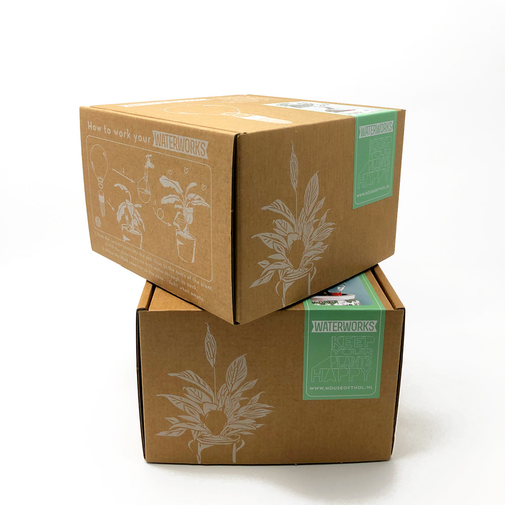Elke Waterworks-set is verpakt in een milieuvriendelijke kartonnen doos met een op maat gemaakte inlay en beschermend krantenpapier.